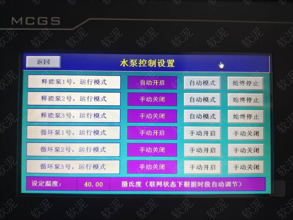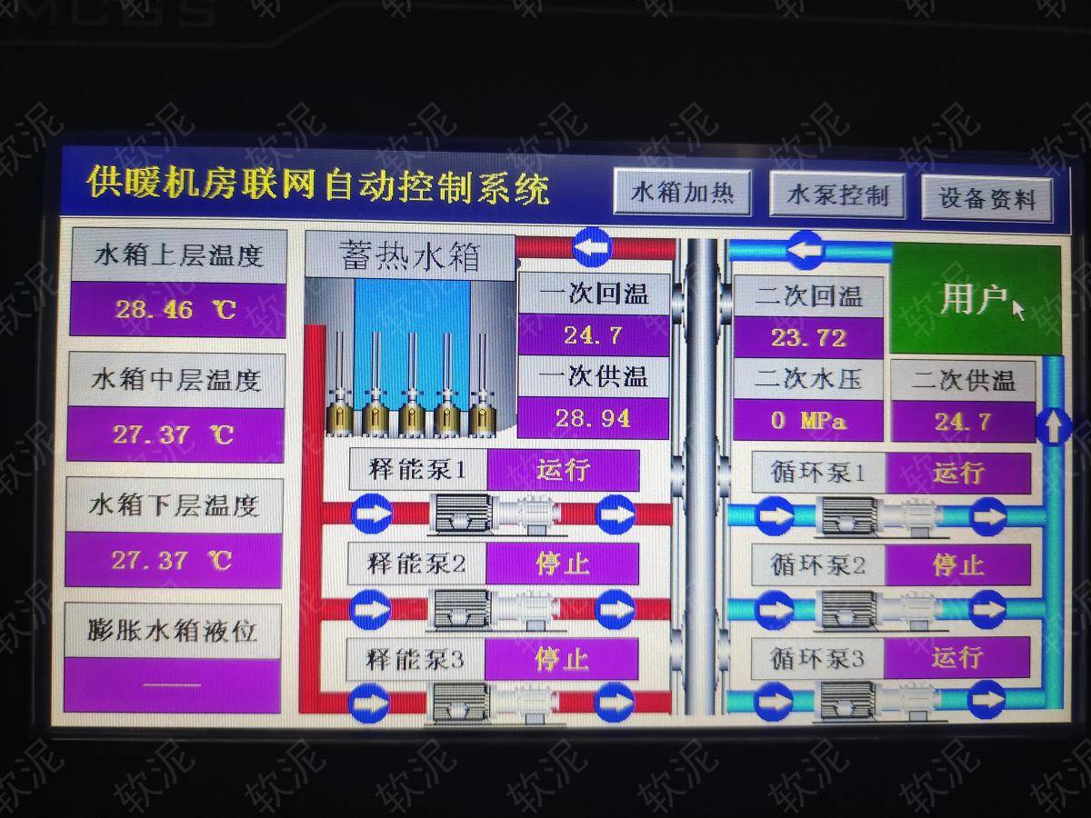 1. 項(xiàng)目位于承德市承德縣高寺臺鎮(zhèn)高寺臺村鑫澤花園小區(qū),冬季供暖系統(tǒng),夜間谷電價(jià)期間給大水箱蓄熱,二次網(wǎng)循環(huán)泵始終運(yùn)行,一次網(wǎng)循環(huán)泵通過間歇運(yùn)行,給板式換熱器升溫,維持二次網(wǎng)恒定溫度。白天不蓄熱,只釋放存儲的熱能,節(jié)約電費(fèi)。 2. 現(xiàn)場沒有人值班,通過手機(jī)軟件隨時(shí)可查傳感器數(shù)據(jù)。不限管理人員人數(shù),每人實(shí)名賬戶,自動保存操作記錄。 3. 設(shè)備可選擇自動模式,根據(jù)設(shè)定參數(shù)自動啟停。也可選擇手動模式,直接啟停每個設(shè)備用于調(diào)試檢修。 4. 配電柜數(shù)量較多,增加了聯(lián)動信號,只需操作總開關(guān)即可直接啟停所有設(shè)備。 |