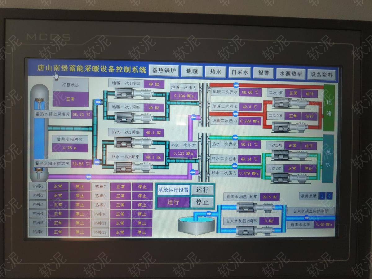 1. 項(xiàng)目位于唐山市曹妃甸區(qū),北堡村附近。加壓泵使用變頻器根據(jù)管道反饋水壓自動調(diào)速運(yùn)行頻率,維持自來水水壓恒定。熱水通過板式換熱器獲得蓄熱水箱的熱能,維持熱水恒溫。 2. 水箱蓄熱功能自動運(yùn)行,反饋電流異常時(shí)能自動顯示故障信息(當(dāng)?shù)仉妰r(jià)沒有峰谷) 3. 制熱時(shí)二次網(wǎng)水泵不間斷運(yùn)行,一次網(wǎng)水泵通過間歇運(yùn)行給板式換熱器維持恒定溫度,從蓄熱水箱獲取熱源。沒有制冷功能。 4. 所有傳感器和設(shè)備運(yùn)行數(shù)據(jù)接入軟泥物聯(lián)網(wǎng)系統(tǒng),機(jī)房自動運(yùn)行無人值守,通過手機(jī)軟件可隨時(shí)查看設(shè)備運(yùn)行情況和修改設(shè)定參數(shù)。 |