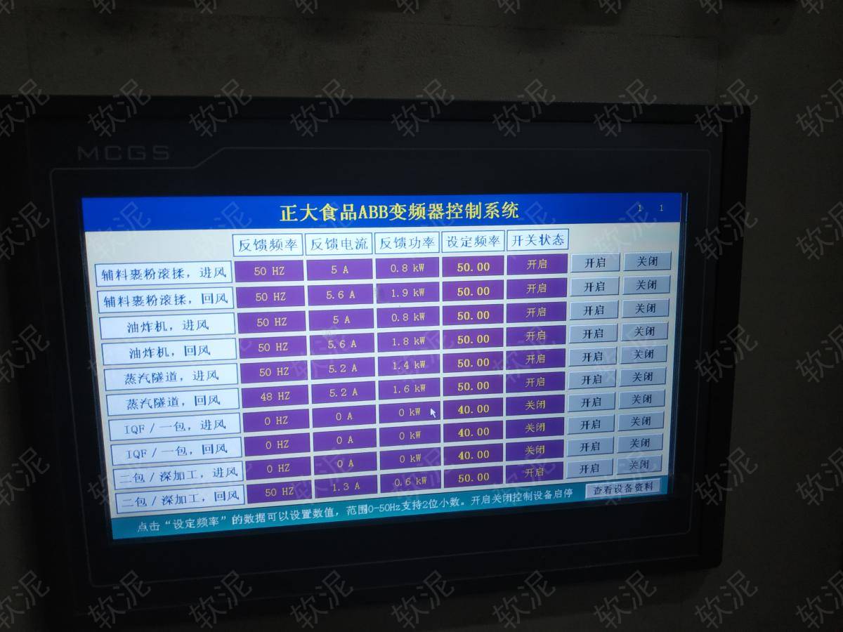 項目位于河北省秦皇島市山海關(guān)區(qū)關(guān)城東路30號正大食品工廠。我們制作的風(fēng)機(jī)變頻控制系統(tǒng)使用觸摸屏,通過485通信控制10臺ABB變頻器,分別控制各個房間(小雞孵化間、養(yǎng)殖間、屠宰間等)風(fēng)機(jī)運行速度。使用軟泥智能控制主機(jī)的4G聯(lián)網(wǎng)控制功能,管理人員通過手機(jī)即可遠(yuǎn)程查看設(shè)備運行狀態(tài),遠(yuǎn)程開關(guān)機(jī)和設(shè)定每個風(fēng)機(jī)的運行頻率。 |