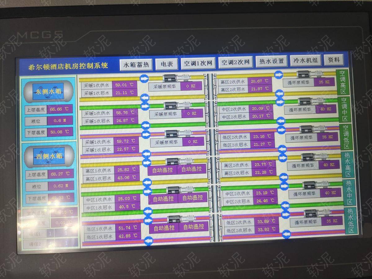 1. 項目位于秦皇島市海港區(qū)河濱路92號希爾頓歡朋酒店,功能包括谷電蓄熱(兩個續(xù)熱水箱)、谷電蓄冷(給消防水池降溫蓄冷)、熱水循環(huán)、空調(diào)水循環(huán)。 2. 蓄熱期間兩個蓄熱水箱各自溫控,蓄冷期間中央空調(diào)給消防水池降溫,只在谷電價格期間運行,節(jié)約電費。 3. 高區(qū)中區(qū)地區(qū),有各自的熱水循環(huán)泵和空調(diào)循環(huán)泵,水壓不同,各自的水循環(huán)系統(tǒng)獨立溫控。 4. 自動模式根據(jù)設(shè)定參數(shù)能自動啟停設(shè)備,手動模式可以直接操作每個設(shè)備啟停用于檢修。 5. 機房24小時有人值班,每人實名制賬戶,操作記錄自動存檔。設(shè)備分布在地下一層和地下二層的很多房間,通過軟泥物聯(lián)網(wǎng)平臺能夠統(tǒng)一管理,直觀的看到所有傳感器和水泵的反饋數(shù)據(jù)。 6. 所有功耗較大的設(shè)備都加裝的電表,進行電流檢測和耗電量統(tǒng)計,自動抄表,可檢索,數(shù)據(jù)可導(dǎo)出Excel文件下載。 |